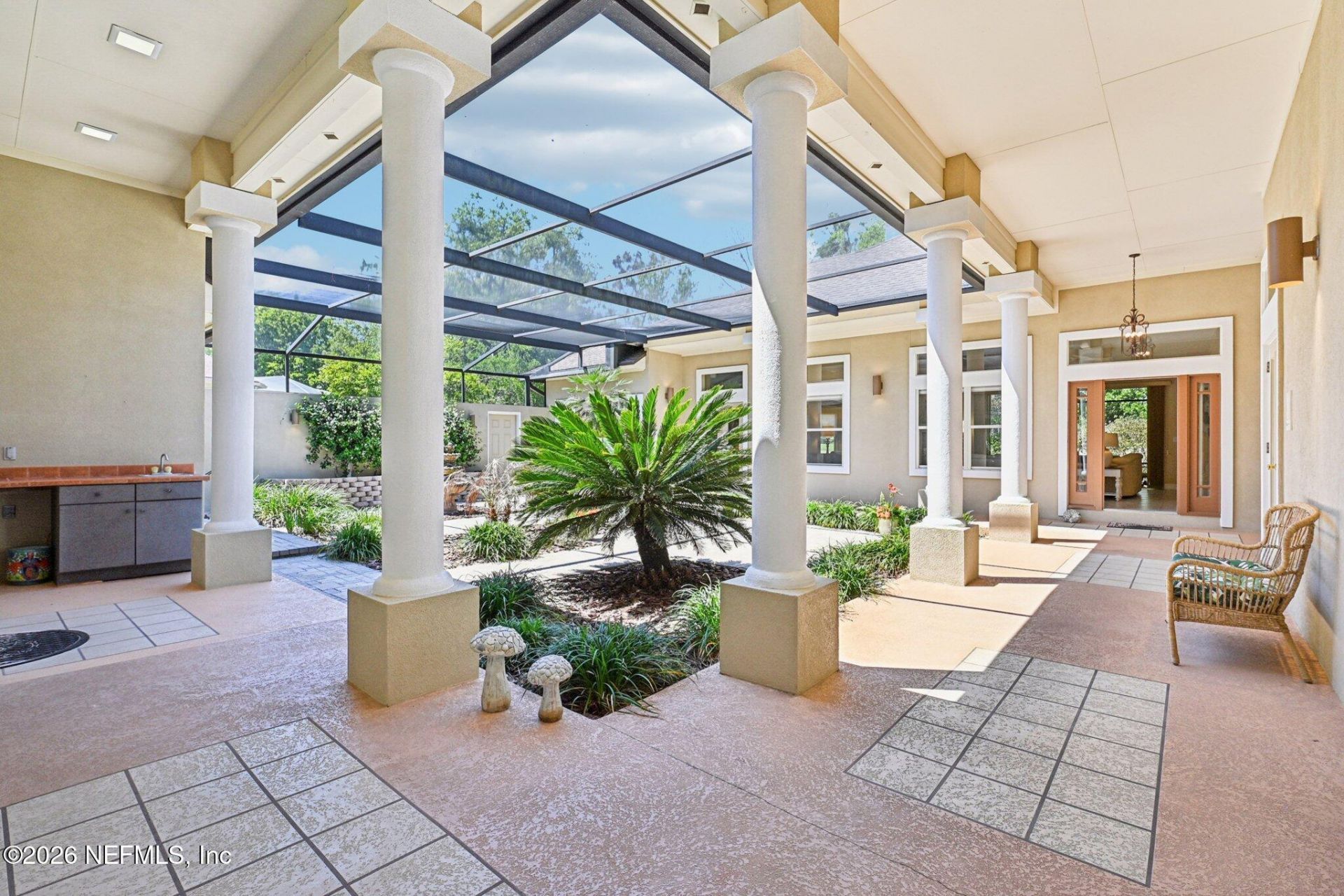 Stunning Courtyard Home on the 8th Hole in Magnolia Point Golf & Country Club.Experience the best of Florida living in this unique courtyard garden home designed to embrace the outdoors, surrounded by windows and French doors that open seamlessly to a private courtyard, plus a wraparound screened lanai, filling every space with natural light.This bright, open floor plan offers 4 bedrooms and 3 bathrooms, including a private 2-bedroom, 1-bath guest wing--ideal for guests, in-law suite, or a home office setup. Pocket sliding doors fully open to the lanai, creating a true indoor-outdoor living experience perfect for entertaining or relaxing year-round.The freshly painted exterior adds to the home's curb appeal, while the thoughtful layout ensures that every room connects to either the courtyard or lanai. Located in a private gated golf course community, residents enjoy a clubhouse, restaurant, and community pool, pickleball, and tennis. Roof 2019, WH 2023, HVAC 2014.